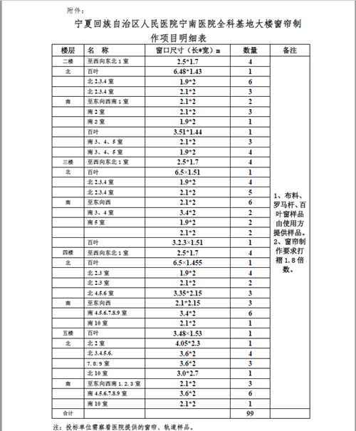 宁夏回族自治区人民医院宁南医院全科基地大楼窗帘制作项目,共计99幅(具体明细详见附件)。